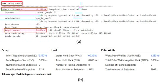The screenshots of “Max Delay Paths” and post-implementation timing summary of . (a) The “Max Delay Paths” part from the post-synthesis timing report. The estimated minimum clock period should be ns, which corresponds to a maximum frequency of 193.72 MHz. (b) The timing summary of the post-implementation when the clock period is set as 5 ns.