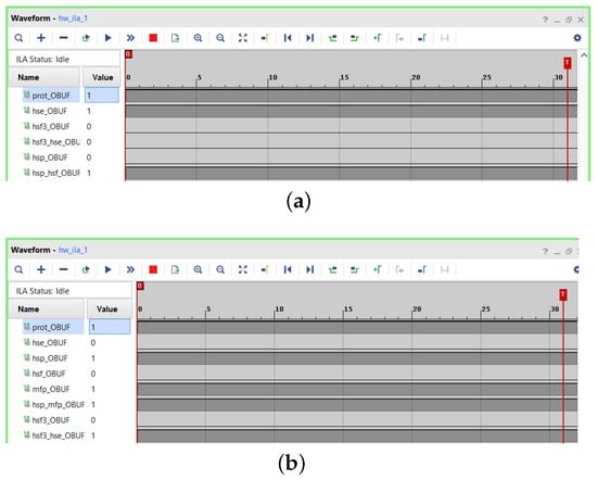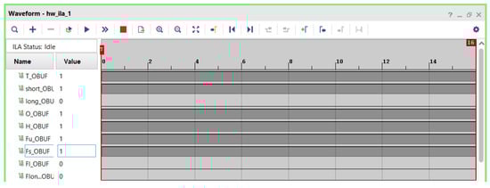 After post-implementation simulation is completed, perform generating a bitstream file and programming the device with this file. As output port variables are marked as debug signals in the Verilog codes, the integrated logic analyzer (ILA) dashboard appears after device programming. Add all the marked signals to the trigger/capture setup windows and run; results calculated by FPGA are shown in the dashboard in the form of waveforms, as can be seen in Figure 7. Compared with post-implementation timing simulation, the dynamic changing of logic values is not captured for the clock period is quite short-ranged.