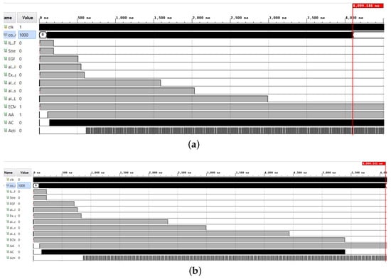 To validate the exactness of RSFIM once more, the expected waveform and RTL model behavioral simulation waveform of Table 7 are portrayed in Figure 9. The clock period of this model is verified as 5 ns after post-implementation timing simulation, which means the computation speed is also steps per second (200 MHz). Hardware debug, which delivers computing results of FPGA implementation of two heat shock response RS, is given in Figure 10.