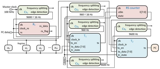 Data frames received by are stored in thirty-two 8-bit registers from to serially. Once a register is fully loaded, a high level signal generated by the edge detection method arises and a counter counts the number of this signal from 0 to 31. The host computer sends data at 9600 baud, and receives data at the same rate. The frequency of is 960 baud because it turns to high level after receiving one frame. The high-level signal drives to begin transmitting data to the RS counter. If the computing rate of the RS counter is larger than 9600 baud, the same bit will be counted multiple times. And if this rate is smaller, some bits will be omitted. Both of these situations give rise to errors. Hence sends 10 bits (a data frame) at the speed of 9600 baud as well, with 0 rather than 1 as the EOF for the reason stated above. Counter counts the number of bits sent by . The counting result of RS counter is transmitted back to the host computer by a normal UART transmitter with 1 as EOF, at the rate of 9600 baud.