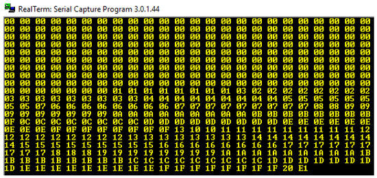 The RTL block diagram of the UART-RS counter is presented in Figure 14. The result of the communication experiment between the host computer and FPGA is shown in Figure 15, where numbers are represented in hexadecimal so that 20 denotes decimal 32. The serial debugging software used to present the counting result is RealTerm 3.0.1.44. This result validates the correctness of RS counter and its UART communication component [].