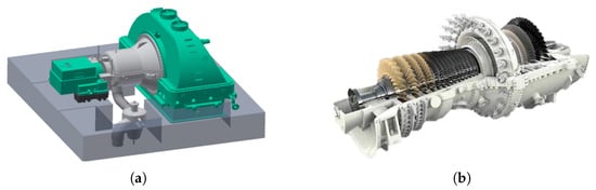 Rotating machinery refers to equipment or devices that rely mainly on rotational movements to achieve specific functions [1], e.g., steam turbines and gas turbines, as shown in Figure 1. They are widely used in different fields, e.g., power, petrochemical, metallurgy, aviation, and aerospace [2,3]. Rotating machinery, comprising the rotating part (rotor) and the static part (stator), is subject to faults during daily operation due to abnormalities, e.g., unbalance, misalignment, shaft bending and cracks, and the wear of key components, affecting industrial production safety or inducing major engineering accidents, even leading to catastrophic accidents [4].