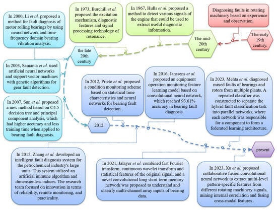 Process and trend of fault diagnosis of rotating machinery development (from the early 19th century to the present) [6,7,8,9,10,11,12,13,14,15,16,17,18].