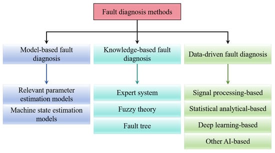 Categories of fault diagnosis methods: model-based, knowledge-based, and data-driven fault diagnosis.