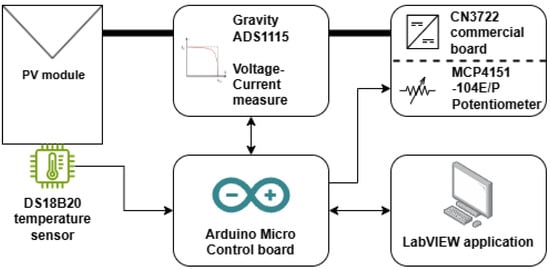 The present work addresses the design, implementation and testing of an educational I-V curve tracer to be used in an indoor teaching laboratory. The device is capable of plotting the I-V curve of a low-power module (5 W, 22 V) using halogen light. The operating principle relies on a DC-DC converter, and although this has been extensively reported [14,15], the design presented here incorporates a significant novelty by utilising a commercial energy harvesting circuit. This system has an advantage over existing ones because it allows for modifying its duty cycle by adjusting an external resistive network. Thus, the operating point of this final circuit is controlled externally via an Arduino Micro board, which acts as an interface between all of the electronics (DC-DC converter, temperature sensor and wattmeter, among others) and a PC. A custom-developed LabVIEW application manages the process, visualises the results, and stores the data. Figure 1 shows a diagram of how the hardware is arranged.