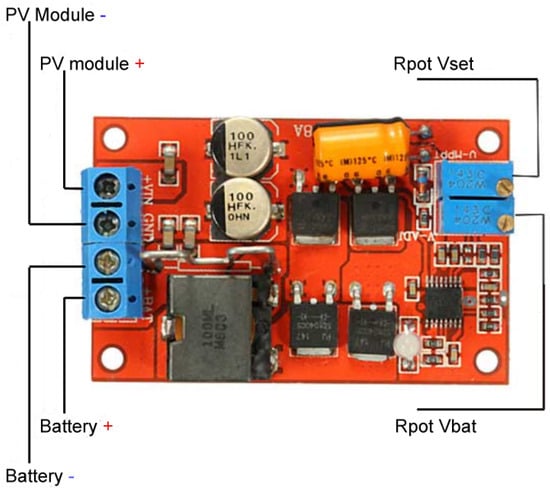 Devices such as the LT3652 by Analog DevicesTM (Wilmington, MA, USA) or the CN3722 by Consonance ElectronicsTM (Nanjing, Jiangsu, China) are low-cost and suitable for connecting low- and medium-power photovoltaic modules (2–40 W). From a technical and prototyping perspective, they have the disadvantage of not being manufactured in through-hole packages. However, the existing SMD variants available on the market allow easy implementation by through-hole sockets and conventional tools. Furthermore, and more importantly, a large number of low-cost commercial boards (<15€) are fully functional, with components—especially those of the external feedback network– which are accessible and replaceable.
