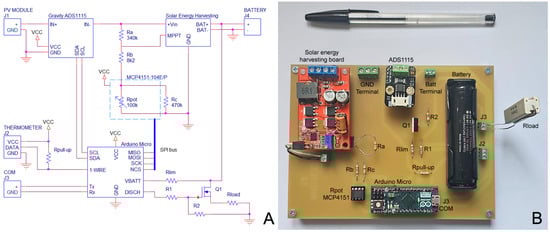 where R is an internal resistor placed in the original energy harvesting board (Figure 2) and is an internal reference voltage generated by the CN3722 integrated circuit, which has a value of 1.04 V at 25 °C and varies with the temperature at −0.4%/°C.