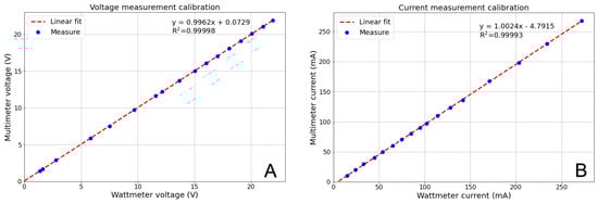 Calibration curve of the voltmeter (graph (A)) and ammeter (graph (B)) included in the ADS1115 wattmeter by GravityTM.