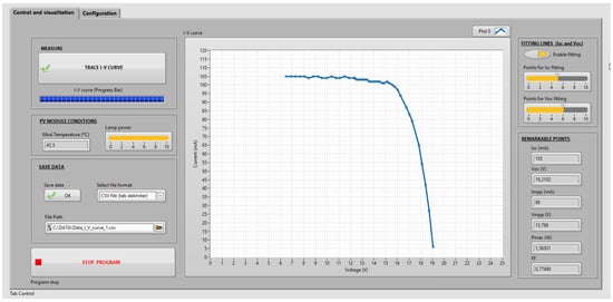 As shown in Figure 5, the Control and Visualisation tab contains the controls which allow the user to launch the acquisition of the I-V curve and to visualise it along with its characteristic points (, , and ), the fill factor and the estimated maximum power. These data can be saved in CSV or Excel format for further analysis.