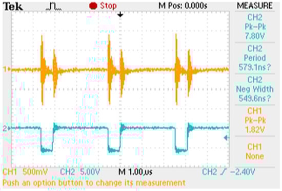 Experimental results for a fixed working point of the digital potentiometer, which caused an input voltage of 15.6 V. The orange line (channel 1, decoupled) corresponds to the voltage ripple at the input of the presented I-V tracer. The blue line (channel 2) corresponds to the voltage between the gate and the source of the switching element of the CN3722 development board.