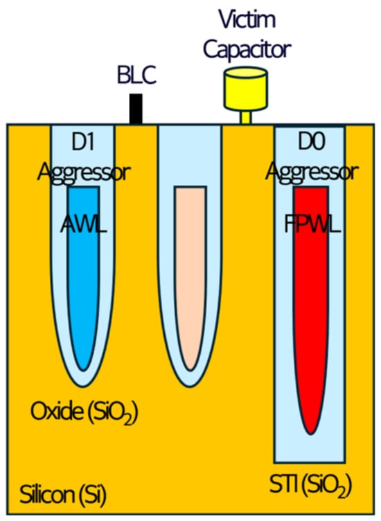 As illustrated in Figure 3b, D0 failure occurs when the aggressor is an FPWL. When an FPWL is activated, the electrons stored in the victim capacitor gather near the FPWL oxide layer. Several of these electrons are captured in the oxide interface traps of the FPWL. When the FPWL is turned off, most of the electrons return to the victim capacitor. Nevertheless, the electrons captured in an FPWL oxide interface trap can diffuse to the BLC. When the aggressor is repeatedly toggled, the number of electrons diffusing to the BLC increases. Consequently, the voltage of the victim capacitor rises, causing the data to change from 0 to 1.