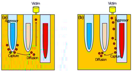 Electron capture and diffusion in (a) D1 failure and (b) D0 failure. The distinction between D0 and D1 failures lies in the position of the aggressor and the physical distance between the aggressor and the victim capacitor.