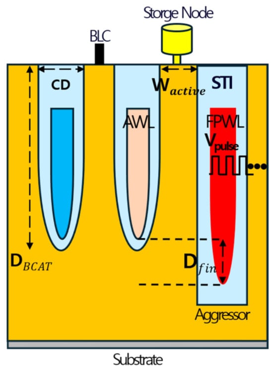 We adopted the 2y nm technology node for DRAM to implement D0 failure. Figure 4 shows a cross-sectional view of a DRAM half-cell. We conducted simulations by implementing a saddle fin structure, which is utilized in the BCAT structure [,,,,,]. In addition, a structure in which 1-RH could be measured was constructed by adding a capacitor. The storage node capacitance was 10 fF. The dimensions of the structure were similar to those of a typical DRAM cell 2y nm technology node. We used the voltage levels within the operating range of a typical DRAM and simulated an environment closely similar to that of the DRAM operation (Table 1). 1-RH was implemented by applying a toggle signal to an FPWL, which acted as an aggressor. To implement the 1-RH in the simulation, we applied a pulse with a 100 ns on/off time and a 10 ns rise/fall time in MixedMode. During the 1-RH, 0.5 V was applied to the drain, −0.3 V to the WLv, and 0 V to the substrate. To evaluate the impact of the 1-RH on the trap properties and structural changes in the device, we measured the average voltage change in the capacitor per pulse. We adopted the following mixed-mode models: (1) doping-dependent Shockley–Read Hall recombination, (2) band-to-band tunneling, (3) continuously variable transmission, (4) Fowler–Nordheim tunneling and direct tunneling, and (5) hot electron injection. This environment is critical for accurately evaluating D0. Based on these structural and voltage conditions, we investigated D0.