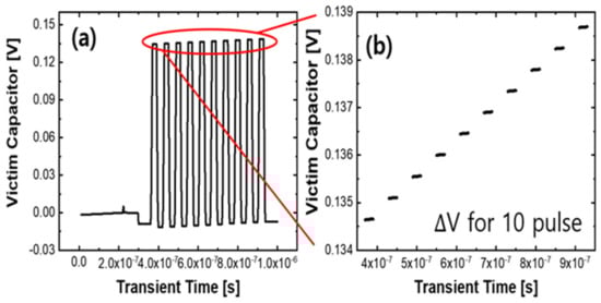 (a) Charging voltage of the victim capacitor with respect to pulse voltage. (b) Variation in the magnitude of the charging voltage of the victim capacitor during 10 pulse voltages.