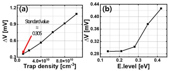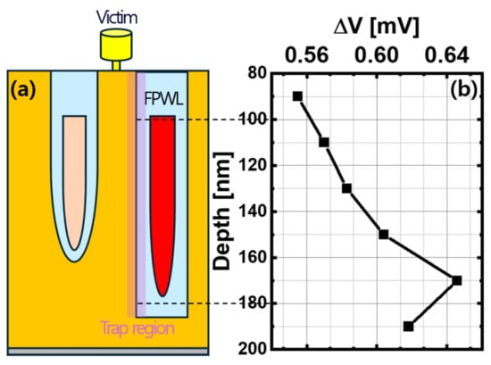 Figure 6a illustrates the interface trap region at the STI of DRAM. The interface trap was formed close to the victim capacitor to investigate its effect on 1-RH. Figure 6b illustrates the tendency of D0 with respect to the trap location. By dividing the trap location by the area, we found that the deeper the trap location, the stronger the D0 failure. However, if the trap location was deeper than the end of the FPWL, D0 was weakened. The deeper the trap location, the smaller the probability of electrons returning to the victim capacitor after being captured, resulting in a stronger D0. Nevertheless, if the trap location was extremely deep, the effect of the FPWL voltage was reduced in the trap area and few electrons would be captured in the trap, leading to a weaker D0. Figure 7a illustrates the correlation between the trap density and D0. As the trap density increased, the ΔV/pulse tended to increase. Figure 7b illustrates the correlation between the trap energy level and 1-RH. As the trap energy level increased, the ΔV/pulse increased. Both the trap density and energy level affected electron capturing during the 1-RH phenomenon. The higher the trap density, the greater the number of electrons from the victim capacitor captured in the interface trap. Additionally, electrons cannot easily be discharged when they are captured at high trap energy levels. If numerous electrons are captured in the trap or remain captured, the probability that D0 will occur is high because these electrons will not return to the victim capacitor. These results demonstrated that D0 failures occurred sensitively depending on the density and energy level of traps on the STI surface. The process results demonstrated that the trap density on the STI surface was closely related to the STI process and was determined by the STI film quality. To suppress D0 failure, the interfacial trap density should be reduced by improving the STI quality.
