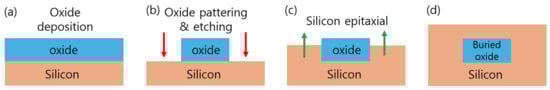 The process steps of buried oxide. (a) Silicon wafer with oxide layer. (b) Oxide after pattering and etching. (c) Growing silicon through epitaxial growth. (d) Buried oxide structure after process.
