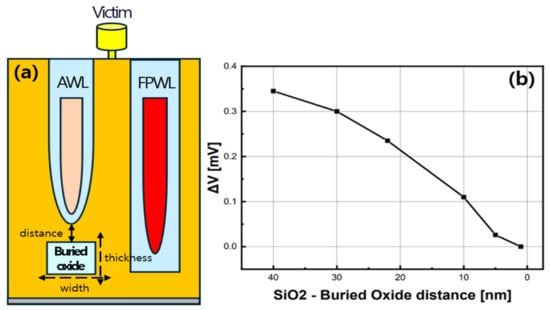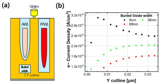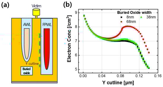 Figure 10a shows the buried oxide region under the AWL oxide. We investigated the tendency of D0 in terms of the distance, width, and thickness of the buried oxide. Figure 10b illustrates the tendency of D0 with respect to the buried oxide and AWL oxide distance. The closer the buried oxide was to the AWL oxide, the weaker the D0 effect. The distance between the buried and AWL oxides affected diffusion during the D0 process. The closer the distance, the more effectively the captured electrons were physically prevented from flowing to the BLC. In other words, the captured electrons could return to the victim capacitor. Figure 11a illustrates the correlation between the buried oxide and D0. D0 was strongly proportional to the thickness of the buried oxide. As the thickness of the buried oxide layer increased, the potential of the substrate decreased, thereby reducing the influence of the substrate voltage on the channel. As a result, when the influence of the electric field generated by the substrate voltage on the AWL channel decreased, the probability of the captured electrons diffusing toward the BLC increased. Figure 11b illustrates the relationship between D0 and the width of the buried oxide. We confirmed that the delta voltage decreased with the width of the buried oxide layer and then increased again. In other words, the optimal width of the buried oxide layer for alleviating D0 failure was identified using the simulation results. The variation in the width of the buried oxide layer affected both the capture and diffusion processes of D0. If the buried oxide layer is thin, electron diffusion cannot be sufficiently suppressed. When the buried oxide layer does not have sufficient width, electron diffusion cannot easily be prevented physically (Figure 12b). Conversely, if the width of the buried oxide layer exceeds a certain threshold, electron capturing cannot be sufficiently mitigated. When the width of the buried oxide layer exceeds a certain level, the effect of the electric field on the silicon active area owing to the substrate voltage decreases. This increases the number of electrons from the victim capacitor trapped in the interface trap (Figure 13b). Consequently, the adoption of buried oxides reduces D0 failure. Optimizing the distance, thickness, and width of the buried oxide layer is crucial for mitigating D0.