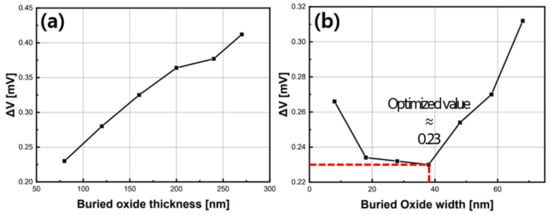 (a) Delta voltage against the thickness variation in buried oxide layer. (b) Delta voltage against width variation in buried oxide layer.