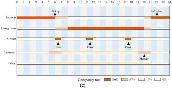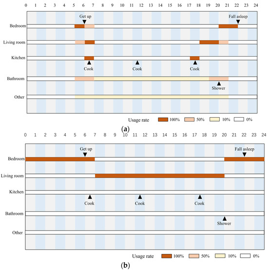 Based on the timetable depicted in Figure 1, it is evident that the work and rest hours of a typical Shanghai family are as follows: waking up and preparing breakfast at 6–7 a.m., cooking lunch at 11–12 a.m., cooking dinner at 5–6 p.m., washing up at 8–9 p.m., and retiring to bed at approximately 10 p.m. The activities of individuals in their bedrooms are primarily concentrated during the wake-up period and the first 1–2 h before bed, while the activities of those in the home after waking up and before bedtime are primarily conducted in the living room. The bathroom is frequently used after waking up and before going to bed, and the kitchen is used during cooking times. This schedule applies to every day.