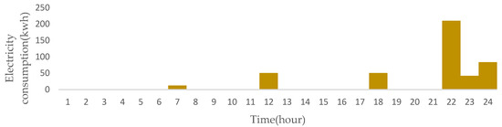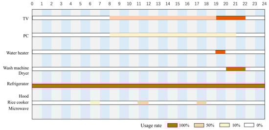 According to the schedule, we summarized the usage times and rates of different appliances. Except for the refrigerator, which operates continuously for 24 h, the TV and PC, as entertainment appliances, may be used from the time of waking up to before going to sleep. The use of the water heater, washing machine, and dryer is associated with bathing activities. The water heater starts running one hour before bathing, while the washing machine and dryer are used after bathing. The range hood, rice cooker, and microwave, as kitchen appliances, are used alternately during cooking times (Figure 2).