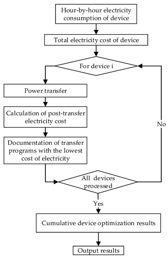 The objective of optimization is to minimize the building’s yearly electricity cost and carbon emissions by optimizing the transfer of transferable loads in accordance with the hourly dynamic electricity price and dynamic carbon emission. This is achieved while ensuring that the total electricity consumption of each device remains constant. The optimization model employs the greedy algorithm to optimize the transferable loads for each day of the year to determine the minimum value of electricity cost and carbon emission cost for each day, which is the local optimal solution (Figure 3). The optimal solutions for each day are then added together to determine the minimum electricity cost and carbon emission cost for the entire year.