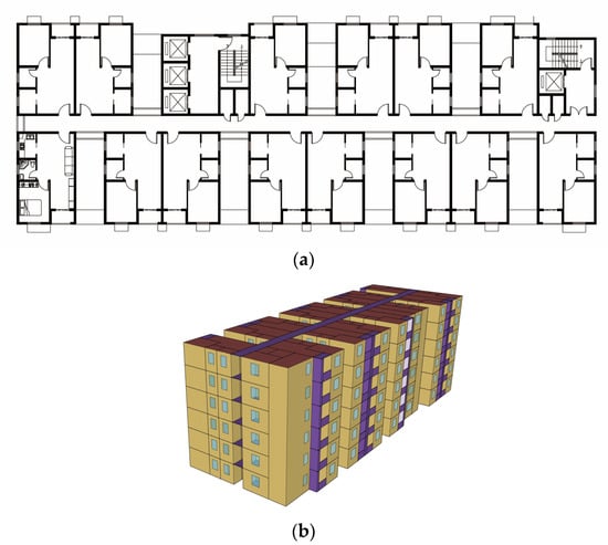 The RSB in Shanghai used as a case study object in this paper is depicted in Figure 4. The standard floor of the building has a total area of 751.52 m2, while a single-unit suite has a total area of 39.64 m2. The story is 3 m high, and each story contains 14 households. The building has a total of six stories and 84 households.