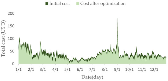 The application of a greedy algorithm for the transfer optimization of transferable loads resulted in a 21.95% reduction in the comprehensive cost of annual transferable loads and an 8.69% reduction in the comprehensive cost of total annual electricity consumption (Figure 6). On a daily basis, the reduction in comprehensive electricity cost of transferable loads fluctuated between 2.08% (on 6 January) and 75.09% (on 18 June), with the daily comprehensive electricity cost reduced by more than 10% on 214 days throughout the year.