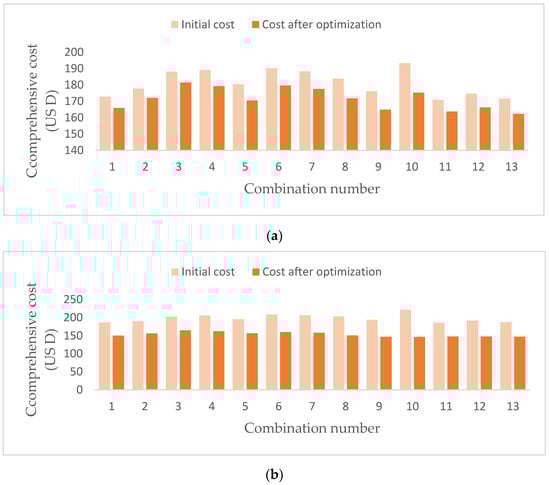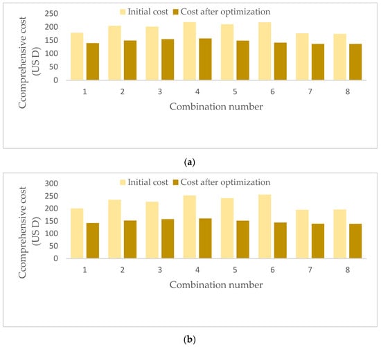 In Charging Mode 2, the average comprehensive cost of the 7 kW charging station is USD 204.49, and the optimized average comprehensive cost is USD 151.47, resulting in an average reduction of 25.62%. Similarly, the average comprehensive cost of the 11 kW charging station is USD 233.07, and the optimized average comprehensive cost is USD 154.62, reflecting an average reduction of 33.2% (Figure 8).