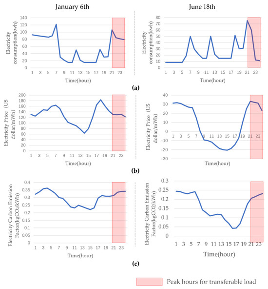 The results in Section 4.2 show that the optimization results of transferable loads fluctuate significantly throughout the year, with the fluctuation ranging from 2.08% to 75.09% on 6 January and 18 June, respectively. By comparing the building power load, electricity prices, and electricity carbon emission factors on these two days, the following conclusions can be drawn: