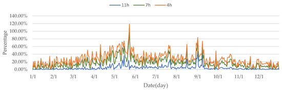Based on the power and usage schedule of appliances, the EnergyPlus software (Version 23.2.0) and 2023 meteorological data were used to simulate the electricity consumption of this residence. The hourly and daily electricity consumption of all appliances was obtained. Non-shiftable loads account for 75.12% of the annual electricity consumption, while shiftable loads account for 24.88%. On a daily basis, the proportion of shiftable loads to total daily electricity consumption fluctuates between 12.31% (9 January) and 30.86% (9 May). Changes in air conditioning load are the reason for this fluctuation, as there is a significant negative correlation between the proportion of air conditioning load and the proportion of shiftable loads (Figure 5).