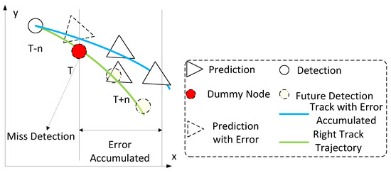 Motivation: As shown in Figure 3, in the autonomous driving scenario with a high frame rate, even when the object undergoes globally non-linear motions like sharp turns or sudden manoeuvrers, it generally functions well. This is because, within short time intervals, the movement of the target object can be reasonably approximated as linear. However, due to sensor noise or occlusion, object detections are frequently lost. Consequently, relying on the Kalman prediction estimation updated based on object detections can lead to the accumulation of errors. In our previous work [24], a bidirectional memory network with forward and backward frame compensation was proposed to make up for the loss of the current frame. It has significantly improved the effect on single-target tracking. Similarly for MOT, considering the loss caused by the occlusion of the objects based on Kalman filtering, we design dummy nodes for observed values to compensate for missed detections. Specifically, when the detections of several previous and following frames are available, we can determine that the current frame is a missed detection. Thus, we add these observed detections as virtual detections for the lost detections to compensate for the loss of observed detections and reduce the accumulated error of the updated Kalman prediction.