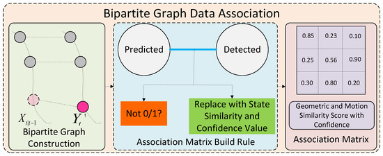 Bipartite graph data association. This bipartite graph is constructed between predicted states and detected states. Instead of using a binary (0/1) association, the association matrix is built using geometric and motion similarity scores between predicted and detected objects. By reducing the complexity from to , where D is the number of detected objects and P is the number of predicted objects, the association matrix becomes more efficient while maintaining accuracy. This matrix now contains similarity scores, improving data association and matching.