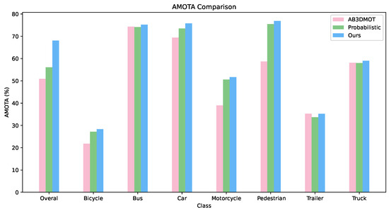 Comparison AMOTA results of overall and seven classes, namely bicycle, bus, car, motorcycle, pedestrian, trailer, and truck, in the NuScenes val set.