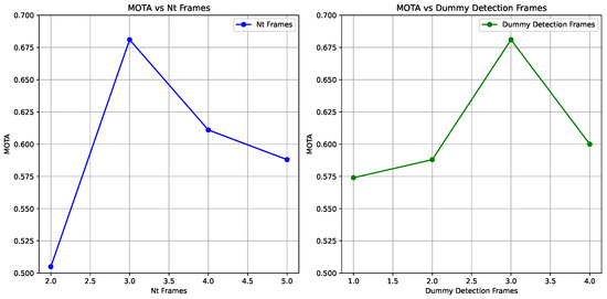 As shown in Figure 6, the left MOTA vs Nt Frames, it can be observed that as (the threshold for consecutive frames with low confidence required to retain a track) increases, MOTA initially rises and peaks at , then gradually declines. This indicates that an optimal threshold (e.g., ) helps balance the stability and reliability of track retention, avoiding premature deletion of valid tracks. In the right plot, MOTA vs Dummy Detection Frames, the impact of increasing future frames for dummy detection on MOTA is evident, with MOTA peaking at , which suggests that within a reasonable range, adding future detection frames as dummy nodes effectively mitigates tracking deviations caused by missing detections, although excessive frames may introduce latency and redundant information.