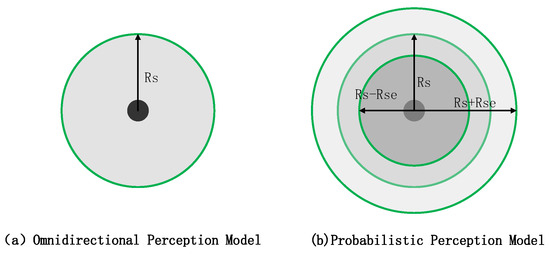 The omnidirectional perception model in Figure 2a refers to a circular area on a plane, centered on the sensor node with a radius . Within this area, the perception probability is set to 1, while outside this area, the sensor perception probability is 0. Here, is known as the perception radius and is determined by the physical characteristics of the sensor node. The omnidirectional perception model is commonly used in application scenarios requiring basic event detection or binary decision-making, such as intrusion detection, smoke detection, and door contact sensors [48]. The advantages of the omnidirectional perception model are its simplicity in calculations and low resource usage. However, its drawback is the inability to handle uncertainty in perception results.