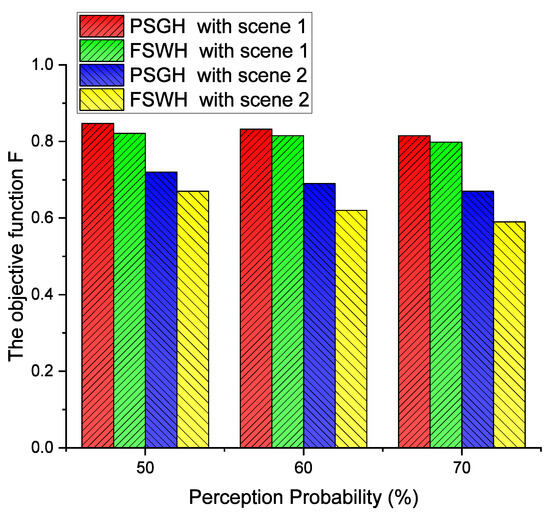 This section primarily studies the comprehensive optimization indicators under different minimum coverage rate requirements. In the simulation setup, we set the perception probabilities to 50%, 60%, and 70%; the minimum connectivity to 2; and the weight of the sub-functions to . Independent 100-simulation experiments were conducted under these three different coverage rate requirements, comparing the comprehensive optimization objective function F and the program runtime under two different scenarios. The results are shown in Figure 5 and Figure 6.