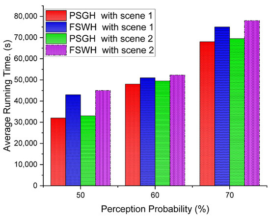 First, we compare the optimization effect on the overall objective function F. In scenario 1, where the monitored targets are uniformly distributed, both algorithms show that the objective function F increases as the required perception probability rises. This is because when the perception probability requirement increases, it leads to an increase in the number of deployed sensors or the use of higher-performance, more expensive sensors for deployment. As a result, deployment costs and energy consumption significantly increase, and the overall perception probability and connectivity also improve. However, the increase in deployment costs and energy consumption outweighs the increase in connectivity and perception probability, which in turn leads to an increase in the overall optimization objective function F. A similar conclusion applies in scenario 2. Next, we compare the running time. As the required perception probability increases, the time taken by the algorithm to search for solutions that meet the conditions also increases, which results in an overall increase in the running time. The algorithm’s running time in scenario 1 is generally lower than in scenario 2, possibly because scenario 2 has more monitored targets, requiring more checks for perception probability and connectivity, thus consuming more time. Finally, comparing the PSGH algorithm with the FSWH algorithm, it is evident that when the minimum connectivity requirement is met and the weights of various indicators are the same, regardless of whether in scenario 1 or scenario 2, and under different minimum perception probability requirements, the PSGH algorithm outperforms the FSWH algorithm in terms of both optimizations of the overall objective function F and the corresponding program running time.