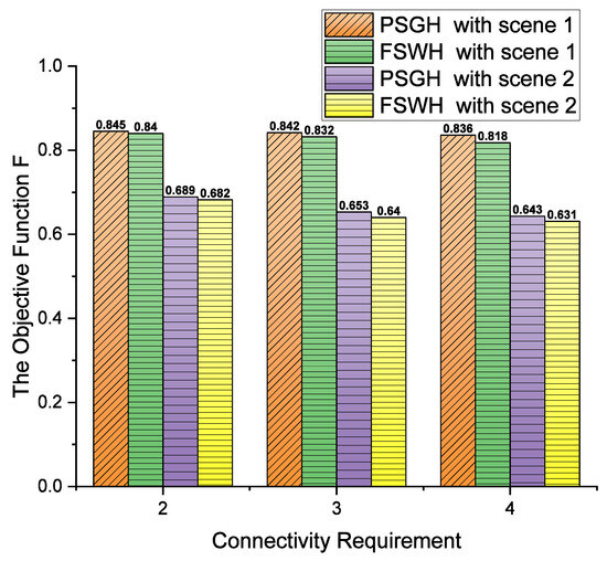 This section primarily studies the comprehensive optimization metrics under different minimum connectivity requirements. In the simulation process, we set the minimum perception probability to 50%, and the minimum connectivity requirements are set to 2, 3, and 4. The weights of the sub-functions are set to . Independent simulations of 100 experiments are conducted under these three different connectivity requirements, comparing the comprehensive optimization objective function F and the program’s running time under two different scenarios. The results are shown in Figure 7 and Figure 8.