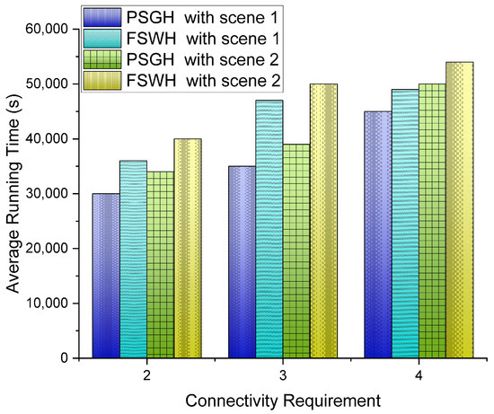 From the above figures, we can conclude that after the minimum coverage and minimum connectivity requirements are determined, adjusting the weights of the sub-functions in the comprehensive optimization function F reveals that when the set minimum perception probability, minimum connectivity requirements, and the weights of various indicators are the same, whether in scenario 1 or scenario 2, or under different minimum perception probability requirements, the PSGH algorithm still outperforms the FSWH algorithm in terms of optimizing the overall objective function F and the corresponding program runtime. Additionally, it can be observed that the value of the objective function F at is significantly lower than at and , indicating that the deployment cost has a greater impact on the objective function.