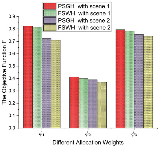 This section mainly studies the comprehensive optimization metrics under different weights for the four objective functions. The minimum perception probability is set to 50%, and the minimum connectivity is set to 2, with different objective function weights , , being applied, where , , . Independent simulations of 100 experiments are conducted under these three different weight distribution requirements. The results are compared for the comprehensive optimization objective function F and the program’s runtime under two different scenarios. The results are shown in Figure 9 and Figure 10.