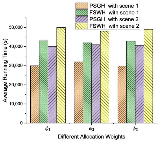 Average runtime of the two algorithms on the objective function under different scenarios and varying weights of the objective function.