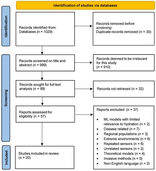 This systematic review was conducted following the guidelines outlined in the PRISMA (Preferred Reporting Items for Systematic Reviews and Meta-Analyses) [31] statement. This approach was chosen over other review approaches to address the lack of comprehensiveness found in other reviews in this area, particularly those examining persistent challenges such as sensor variability, the role of multi-sensor fusion, and limitations in experimental datasets. Alternative review designs, such as scoping or narrative reviews, were considered but found less suitable for the objectives of this study. Scoping reviews, while useful for mapping the extent of research in emerging fields, lack the depth needed to critically assess methodological quality and derive insights into key challenges. Narrative reviews, although beneficial for providing a general overview, are often less systematic and may introduce selection bias, making them unsuitable for exploring nuanced issues like model complexity and dataset diversity. Given the limited number of existing reviews that adequately address the persistent challenges in the area, a systematic review approach was deemed most appropriate. Its structured methodology allowed for a focused evaluation of studies leveraging digital technologies such as software applications (mobile or desktop), data analytics, and machine learning, for sensor-based hydration/dehydration monitoring. Specifically, the use of PRISMA ensures the inclusion of high-quality studies, thus providing a good foundation for identifying gaps.