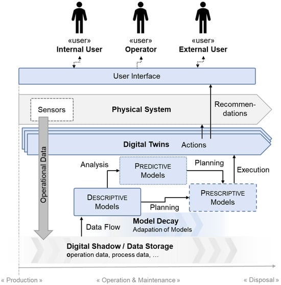 Especially, the models form the unique character of a Digital Twin. Eramo et al. [13] identified, based on the Model Analysis Data Framework [14], that a Digital Twin contains three different kinds of models. First, descriptive models for the allocation and identification of operational and external data. Second, predictive models, which analyze the operational data regarding the specific purpose e.g., a simulation model that investigates the remaining useful lifetime. And third, prescriptive models, which serve as action models to transfer the results of the descriptive and predictive models into specific actions or recommendations for the operator or stakeholder. While predictive models are mainly implemented through simulation models or machine learning algorithms, descriptive and prescriptive models have no standard approach for their implementation. Different approaches for their implementation are discussed, e.g., the use of system models such as SysML to transfer visual models into executable system architectures [15,16], which is described as the reuse and utilization of system models [17]. An additional significant aspect for this is the consideration of model decay that describes the necessary adaptation of these models over the lifetime of a Digital Twin. Figure 1 shows a visualization of the Digital Twin concept that contains the main elements of a Digital Twin and maps them on the lifecycle. A common misunderstanding for Digital Twins is the lack of a physical counterpart e.g., for virtual prototyping. A Digital Twin requires a physical counterpart that creates the operational data.