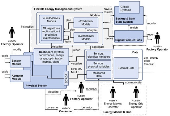 The Flexible Energy Management Platform links both the physical system and the data platform, optimizing the physical system based on the information collected and processed within the data platform. This platform aims to fully digitally represent the physical system through descriptive, predictive, and prescriptive models, and requires important knowledge about the physical system and its conditions and dependencies. Insights from the system are modeled in MBSE system models using SysML. The processed and consolidated data from the data platform are used to create a descriptive model of the physical system. This summarizes and characterizes both the current and historical asset condition and performance. This model is used to generate insights into asset performance, trends, and utilization rates. A further predictive model of the physical system is developed using the outputs of the predictive model along with supplementary data from the data platform to forecast future performance, risks, and behavior of the physical system. This may involve techniques such as regression modeling or machine learning algorithms. The outputs from the descriptive and predictive models, along with any additional relevant data from the data platform, are analyzed to establish a prescriptive model of the physical system. This model employs machine learning optimization algorithms to formulate actionable strategies for the physical system, thereby enhancing accuracy with each iteration. To effectively motivate the owner and operator of the physical system, it is essential to economically optimize based on the asset’s lifecycle costs. This entails using market or grid conditions that enable the asset owner to secure financial benefits, even when adopting strategies such as reducing production speeds or prolonging maintenance intervals. Once an optimal strategy for the physical system has been identified, it is communicated to the dashboard, where the factory operator can review, interact with, and override automated controls as necessary. Furthermore, all physical system data representing asset information and specifications are compiled into a digital product passport that can be examined by the factory operator and accessed by essential systems, including the backup and safe state system.