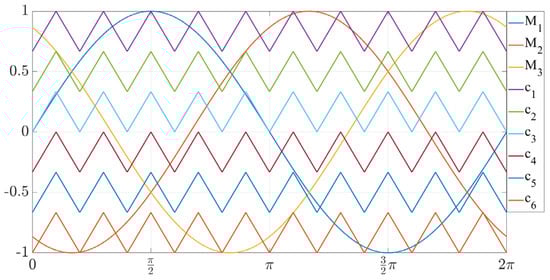 In this work, the chosen modulation technique is the MC PWM due to its simple implementation and good response in terms of harmonic content. Among the MC PWM strategies reported in the recent literature [46], the phase disposition (PD) modulation scheme has been implemented; the modulation schemes employed for the three-phase seven-level CHBMLI, which is appliable to asymmetrical configurations, consist of three modulation signals (M1, M2, and M3) and six carrier signals (c1, c2, c3, c4, c5, and c6), as is shown in Figure 2.
