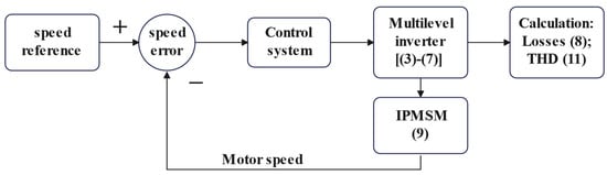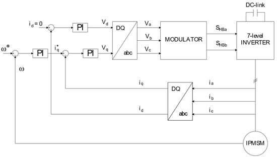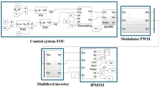 Concerning the control strategy adopted for this work, as shown in Figure 4, the field-oriented control has been chosen with the integration of a multilevel inverter (either symmetrical or asymmetrical). The MATLAB/Simulink® R2024a environment was employed to simulate the behavior of the whole electrical drive system. The control scheme comprises both speed and current closed loops. The speed error is processed by a PI regulator to obtain the reference current, whereas the reference direct-axis current component is set equal to zero. From these signals, the reference direct-axis and quadrature-axis reference voltages are obtained, namely and , respectively. Finally, the Clarke and Park transformations allow the dq signals to convert into a three-phase reference frame, from which the voltages are sent to the three modulation signals of the MC PWM pattern. Therefore, through these modulation signals, it is possible to derive all the switching signals of each power component of the ACHBMLI. The Simulink model implemented is shown in Figure 5. Four different blocks can be identified, and they correspond to the models of IPMSM, power converter, modulator, and adopted control strategy.