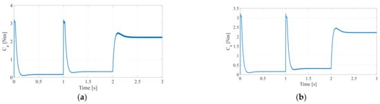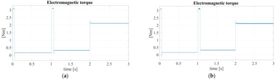 Similar results can be appreciated in Figure 7, which illustrates the system response in terms of electromagnetic torque to variations in reference speed and load for both symmetrical and asymmetrical power converter configurations. Very small differences can be detected by comparing the two trends; in both cases, the electromagnetic torque, after a short transient period, stabilizes its value in any operating conditions previously reported. The slight difference is detected during the transient period applied at 2 s, where the application of the rated load causes a lower undershoot for the ACHBMLI (0.11% instead of 0.12%).