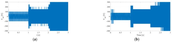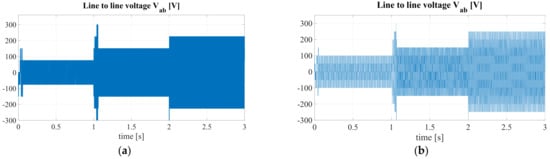 The time trends of the line-to-line voltages are depicted in Figure 8. As well as for the previous results, it can be observed how similar the voltage transient and steady-state responses to changes in load and reference speed are for both symmetrical and asymmetrical converters.