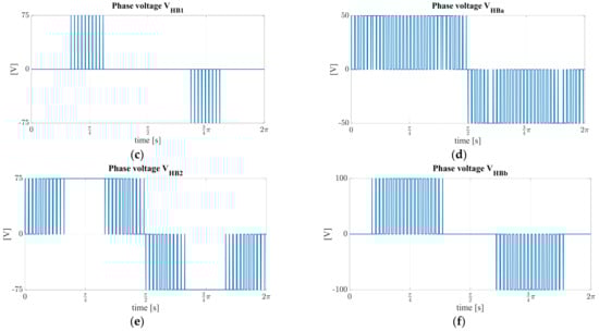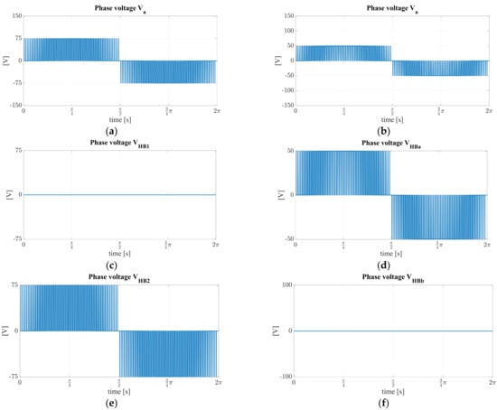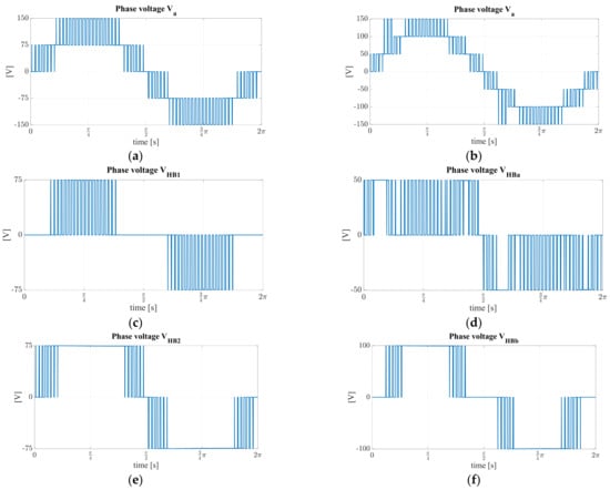 To show how the output voltage from the converters varies under different operating conditions, Figure 9, Figure 10 and Figure 11 report the phase voltage waveforms Va and the individual voltage contributions of each single bridge (for CHBMLI: VHB1 and VHB2; while for the asymmetric configuration: VHBa and VHBb).
