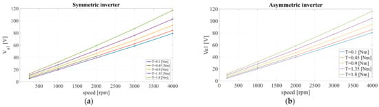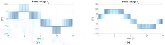 Table 1 summarizes the parameters of the symmetrical and asymmetrical inverters considered for this study. It must be highlighted that some circuit parameters, such as the DC-link capacitors and the typology of power components, have not been changed to provide a consistent comparison between the two inverters. The main data of the IPMSM used for the proposed analysis are reported in Table 2. The technical features of the inverter were chosen to be perfectly adaptable with the available IPMSM; indeed, both the CHBMLI and ACHBMLI are designed to generate line-to-line voltages higher than the rated voltage of the IPMSM.